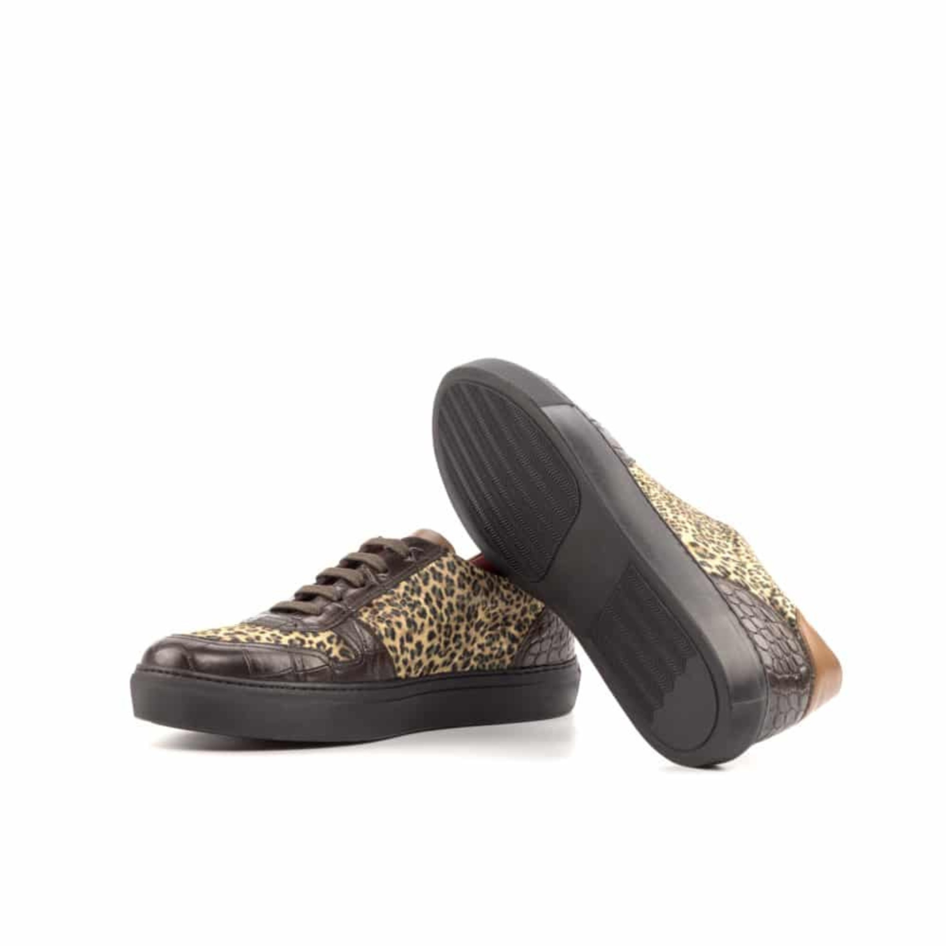 The toe box, eyestay, and back of the trainer are adorned with croco embossed calf leather in a deep brown shade, adding a touch of luxury to the overall design. The tongue and heel tab feature a beautiful, medium brown painted calf leather, adding depth and dimension to the trainer.
