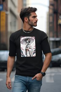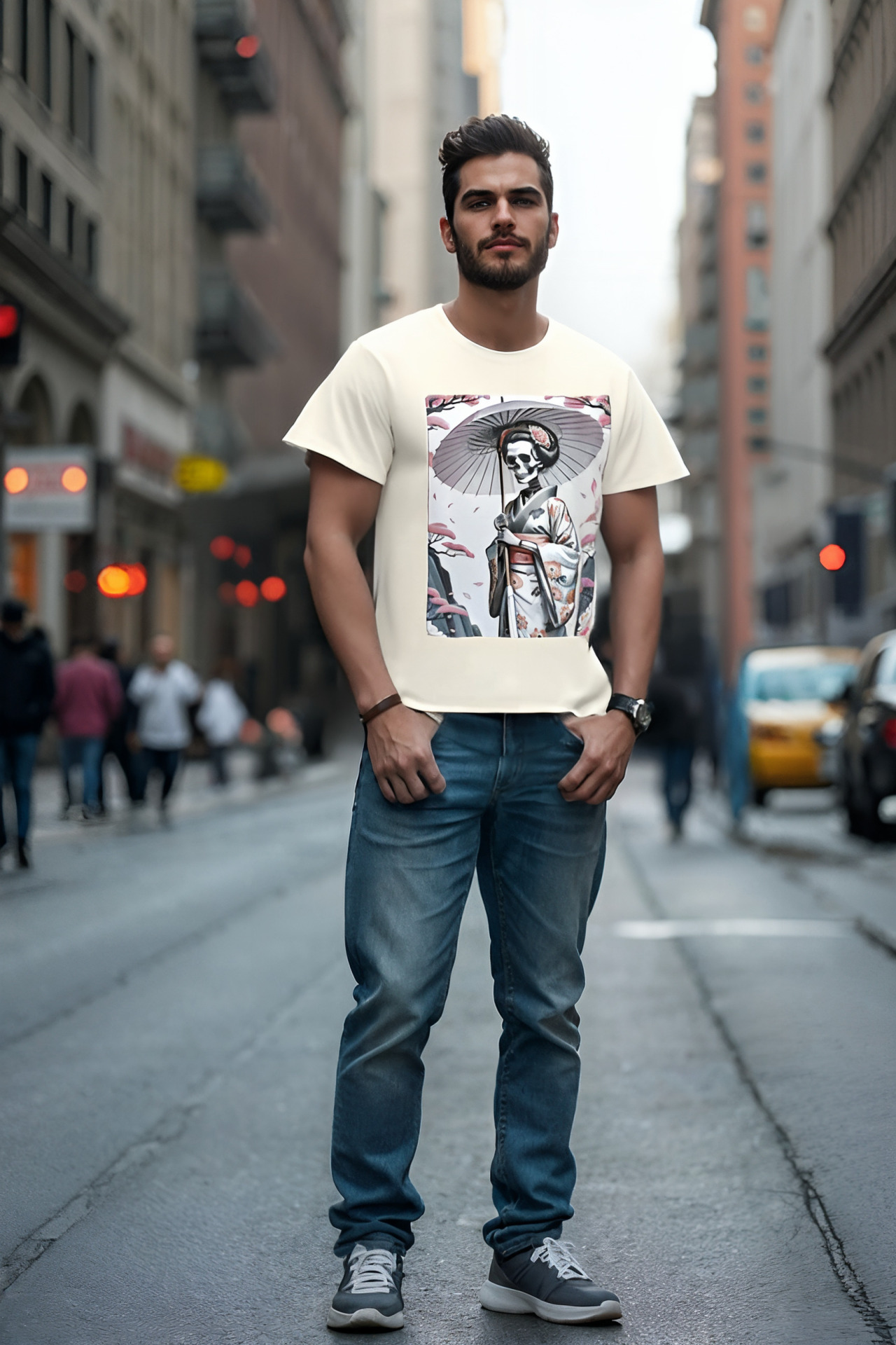Elevate your wardrobe with the “Vanitas in Kimono” T-shirt, a striking blend of elegance and artistry. Featuring a beautifully detailed design of a figure in a traditional kimono holding a parasol, surrounded by serene cherry blossoms, this piece celebrates timeless beauty and cultural sophistication. Crafted for comfort and style, this T-shirt is perfect for those who appreciate artful fashion.