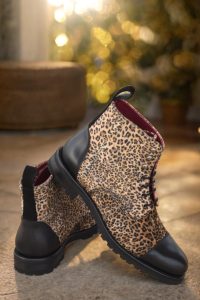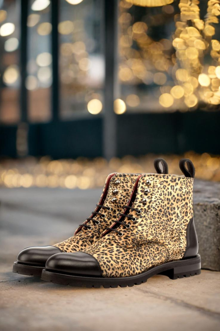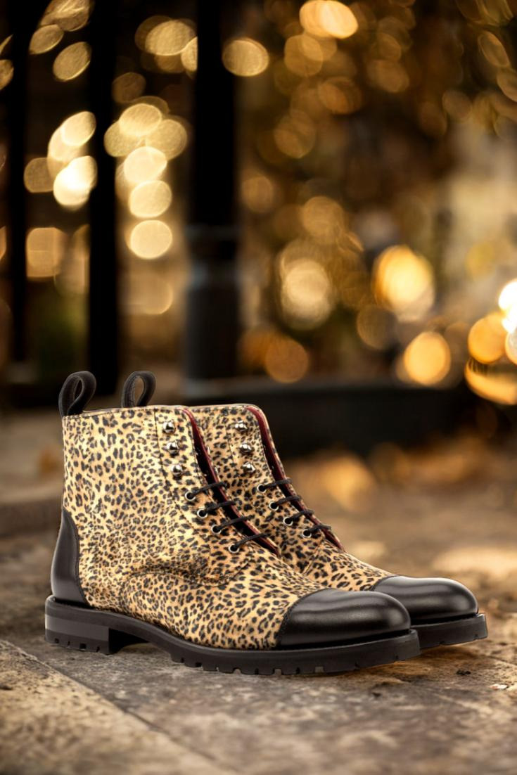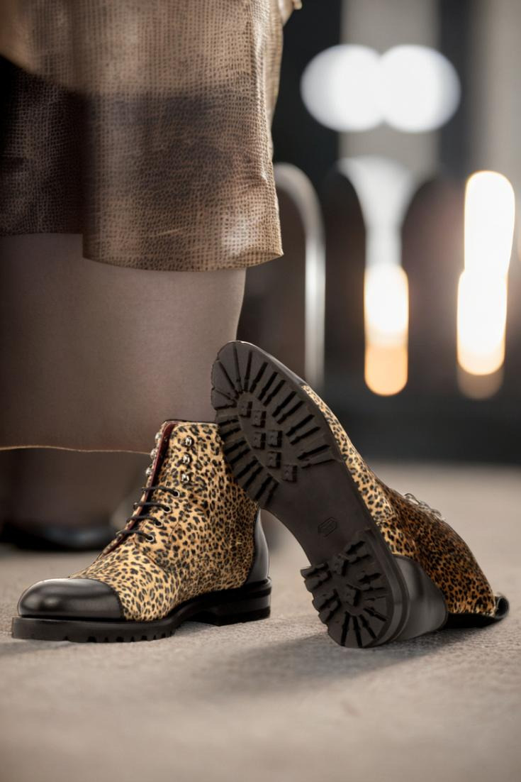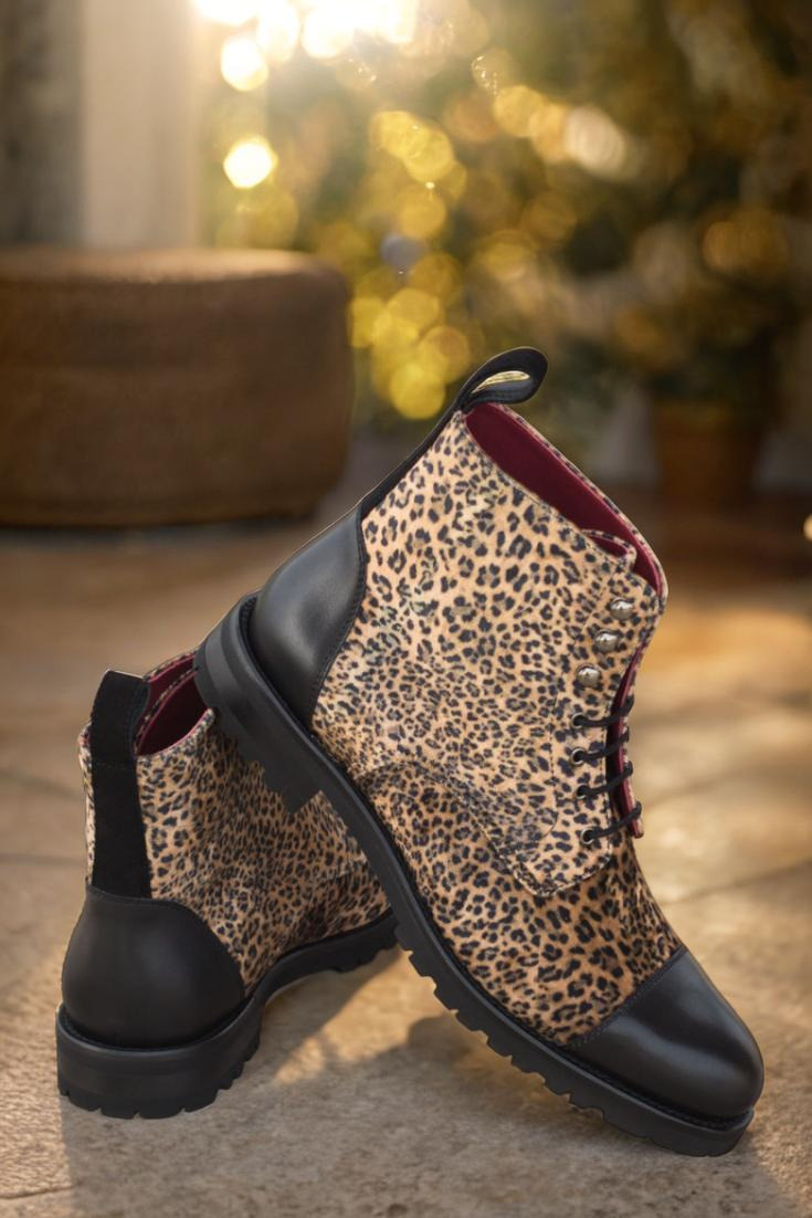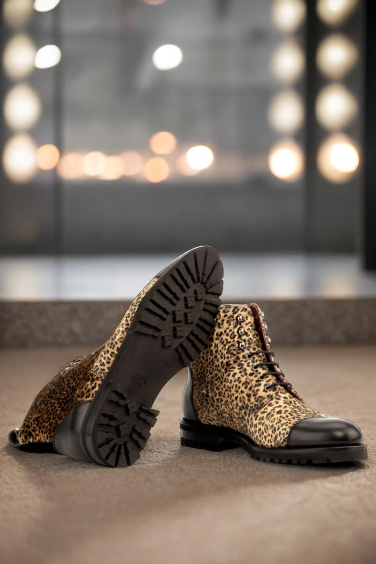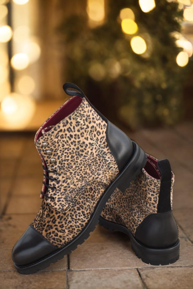 Crafted with precision in Spain, these boots feature a stunning leopard print upper, coupled with a striking black painted calf and kid suede. The eyelets in a sleek graphite finish add a subtle touch of edge, while the black laces beautifully contrast with the bold and eye-catching design.
