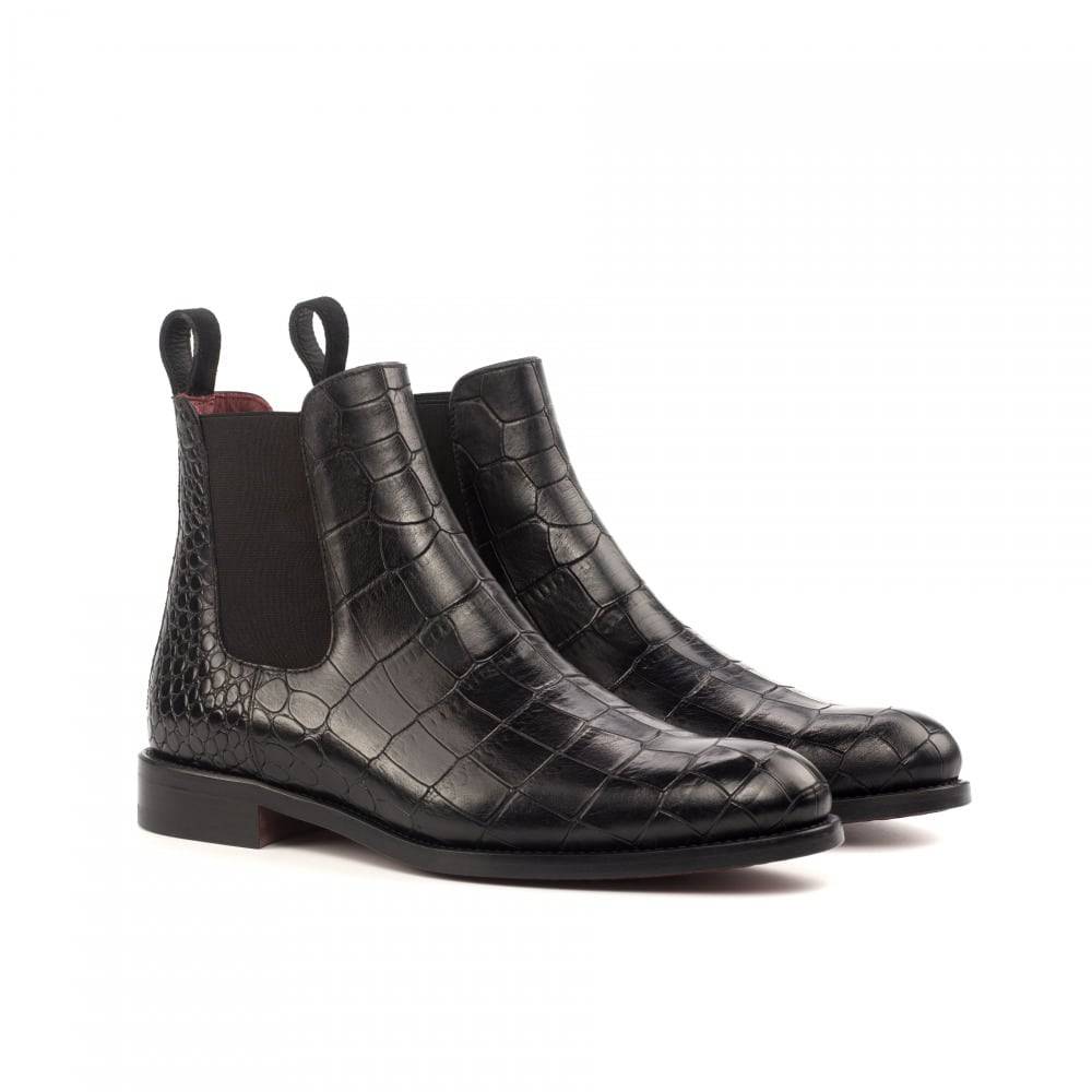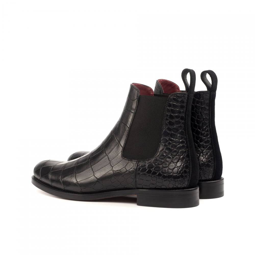 Starting at the front, the sleek and elegant design features black croco embossed calf leather, giving the boot a luxurious texture that will turn heads on every street corner. The sides and back also feature the same croco embossed calf leather, showcasing the impeccable craftsmanship and consistency throughout.