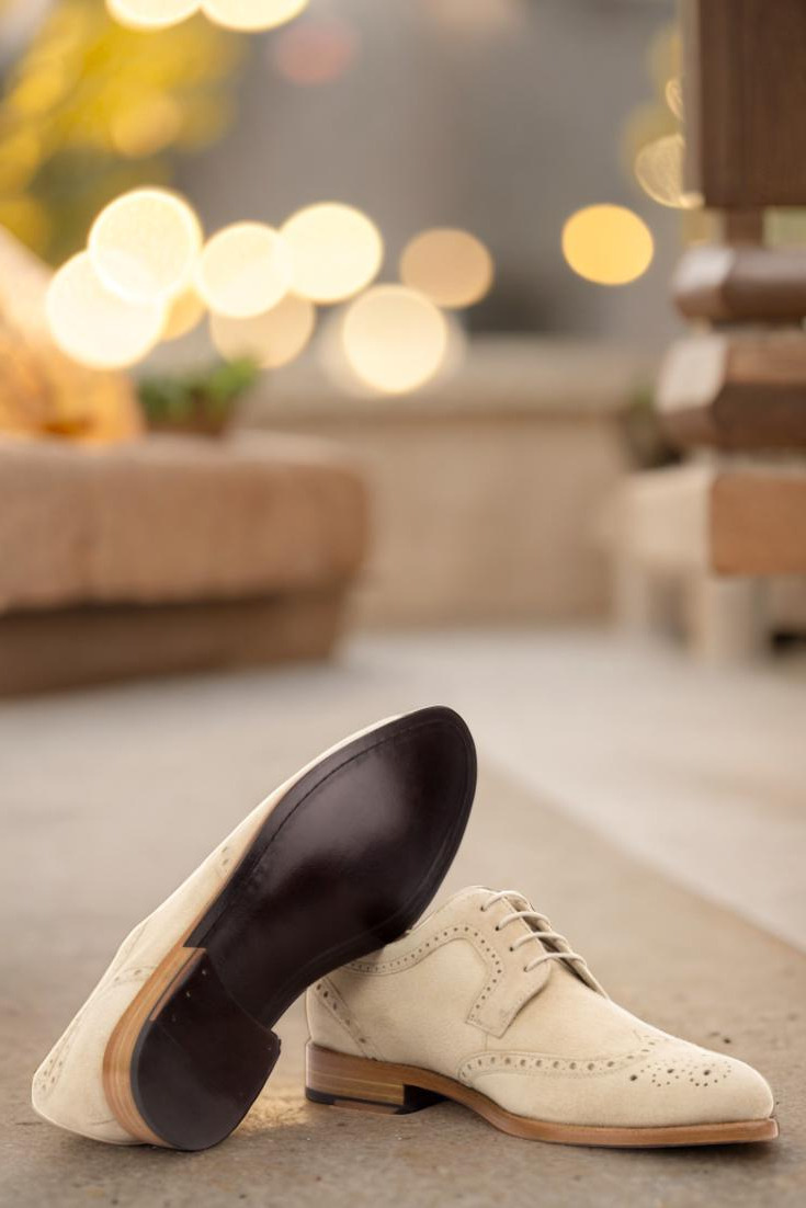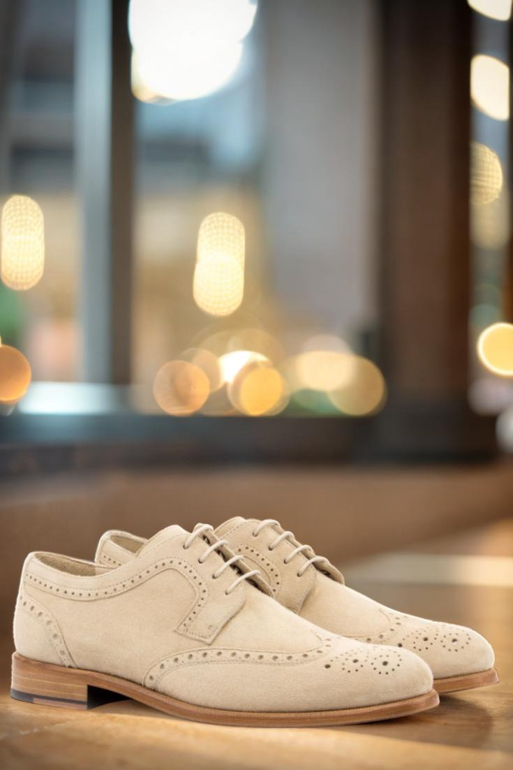 Crafted with the finest materials, this shoe features taupe kid suede uppers that will elevate any outfit. The classic wingtip design is complemented by the matching taupe laces, creating a seamless and cohesive look.