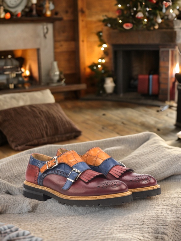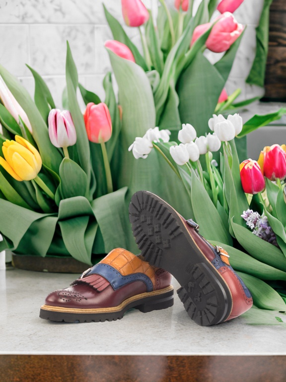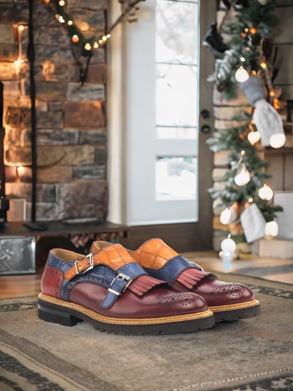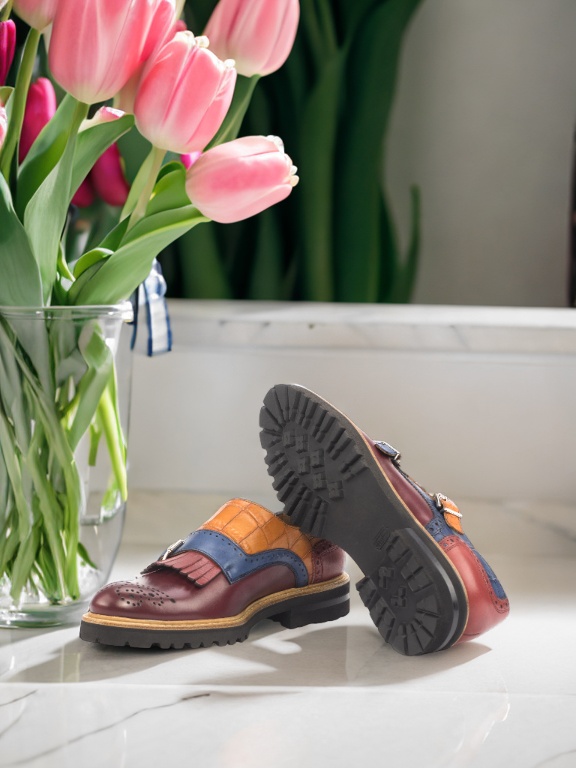 The toe cap of this shoe is made with luxurious burgundy box calf leather, adding a touch of classic charm to the design. The side features an eye-catching navy blue croco embossed leather that sets this shoe apart from the rest. The base is crafted with cognac croco embossed leather, providing a subtle contrast and adding depth to the overall look.
