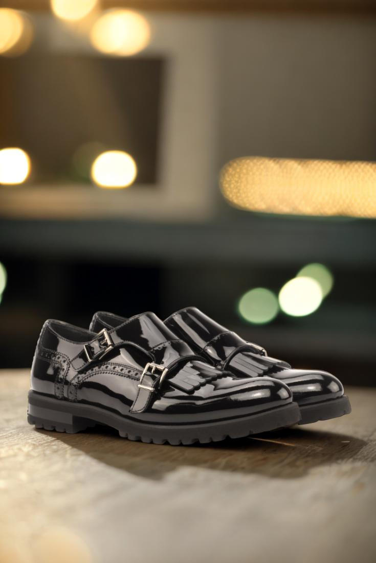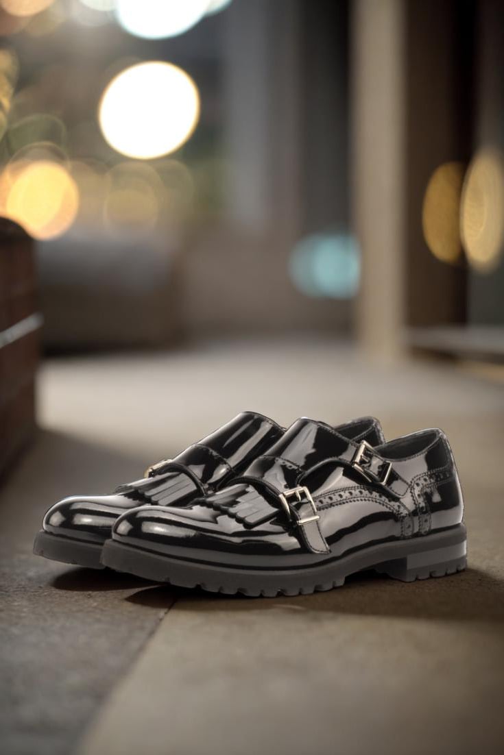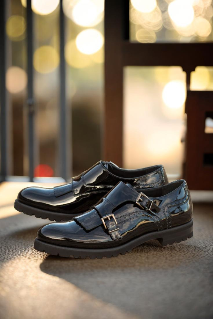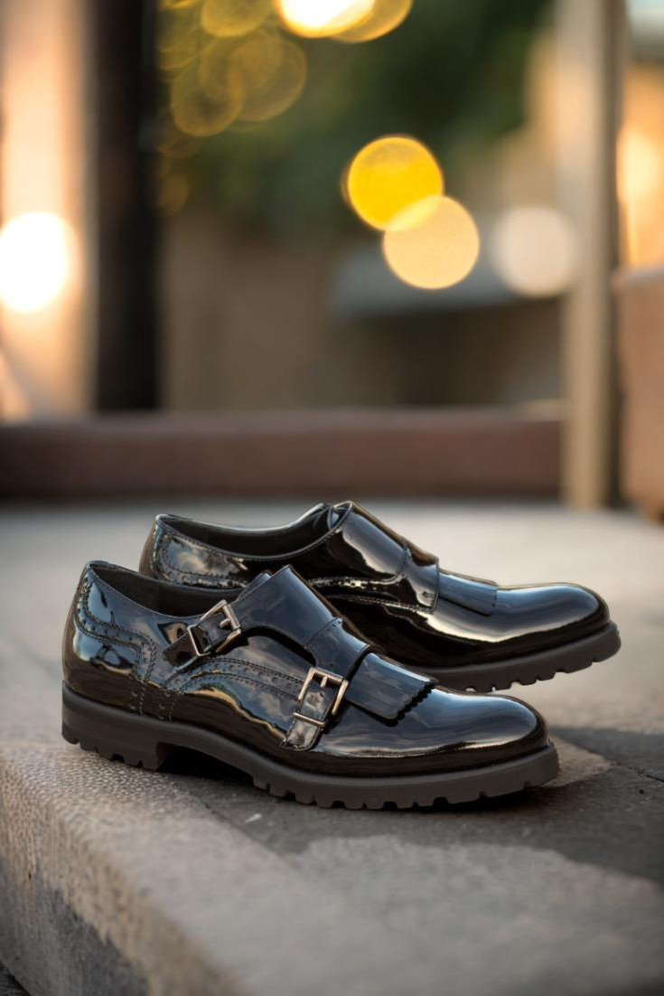 With a base, toe cap, side, fringes, collar, and back all made from luxurious black patent leather, these shoes exude sophistication and class. The graphite buckles add a touch of modernity, creating a unique and eye-catching design.