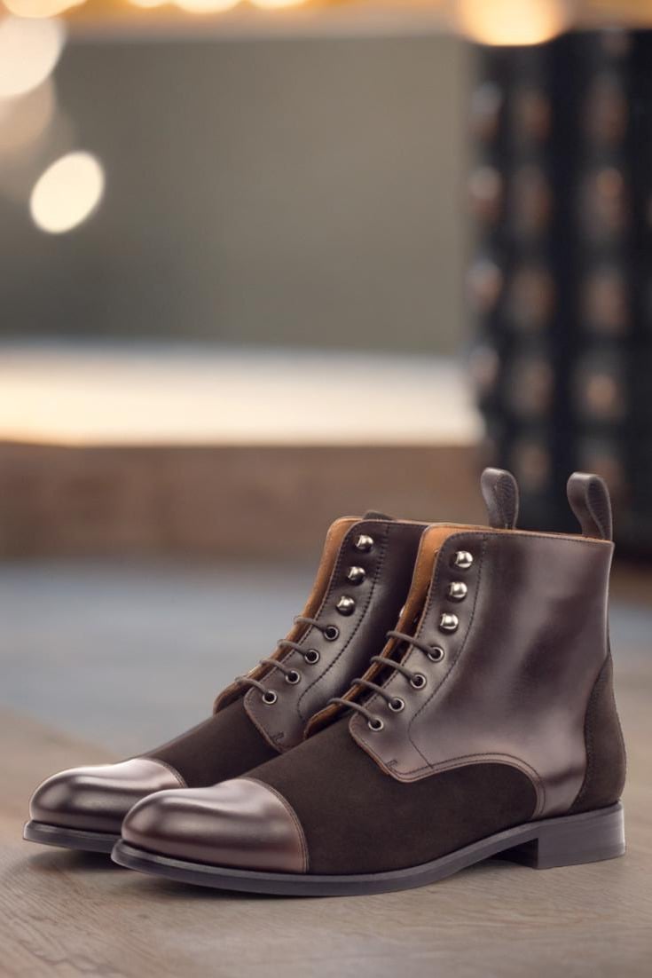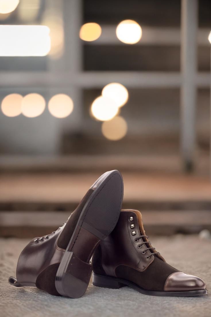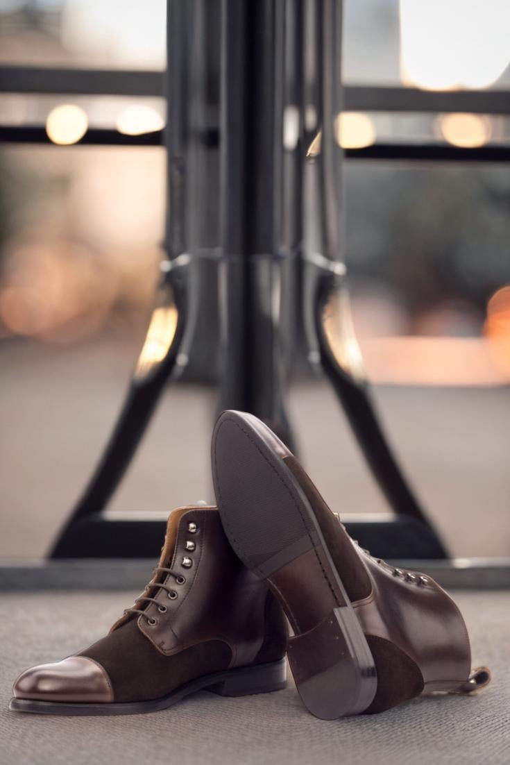 The uppers feature a blend of Dark Brown Luxe Suede and Painted Calf Leather, creating a rich and luxurious texture. The eyelets in striking graphite add a touch of modernity to the classic silhouette, while the brown laces perfectly complement the overall look.