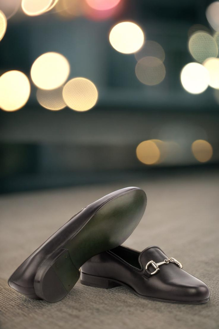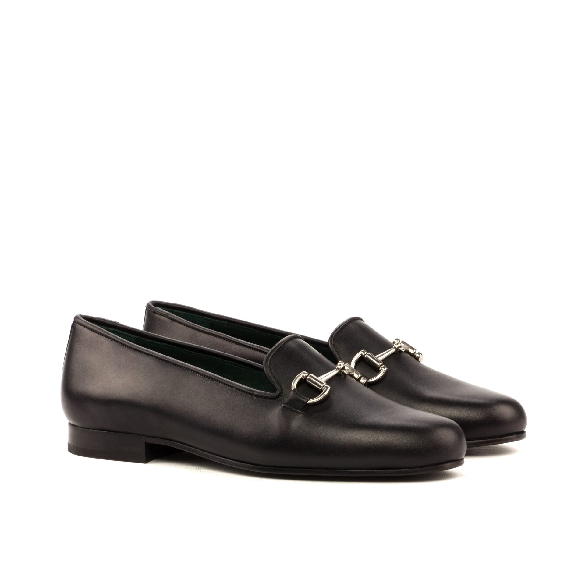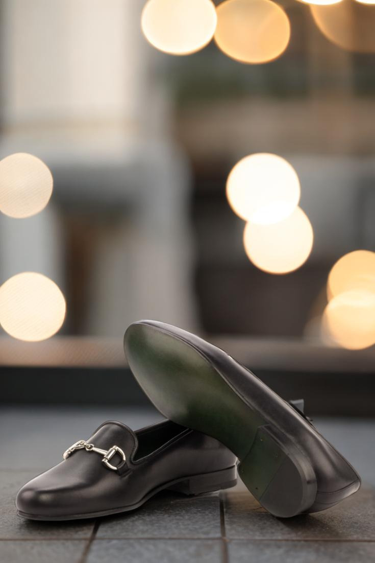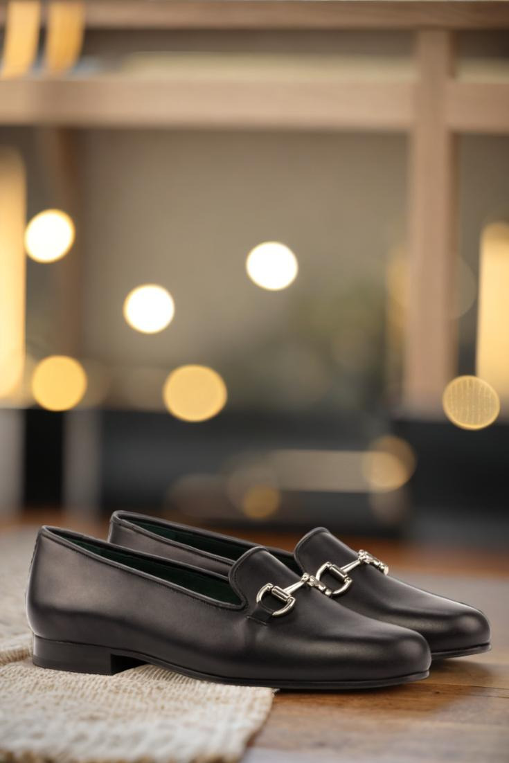 The uppers are made of premium black painted calf leather, giving them a sleek and sophisticated look. The trim, also in black painted calf, adds an extra touch of refinement. The bit, made of nickel, adds a subtle touch of shine to elevate the overall design.