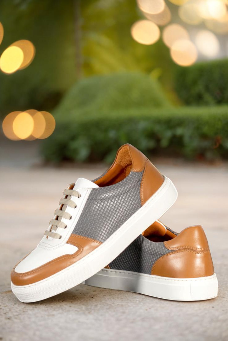 Crafted with the finest materials, these trainers feature a unique design that is sure to turn heads. The toe cap is made of a luxurious Grey Wooven Print Painted Calf, while the rest of the shoe boasts a combination of White Nappa Leather, Medium Brown Nappa Leather, and Olive-Full Grain Leather for a sophisticated and versatile look.