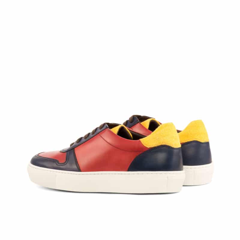 To add a touch of contrast and flair, the toe box and eyestay are painted in a rich navy blue calf leather. This not only adds a pop of color but also provides added protection for your feet. The heel tab and tongue are made of a soft and breathable mustard yellow linen, making these trainers a comfortable choice for all-day wear.